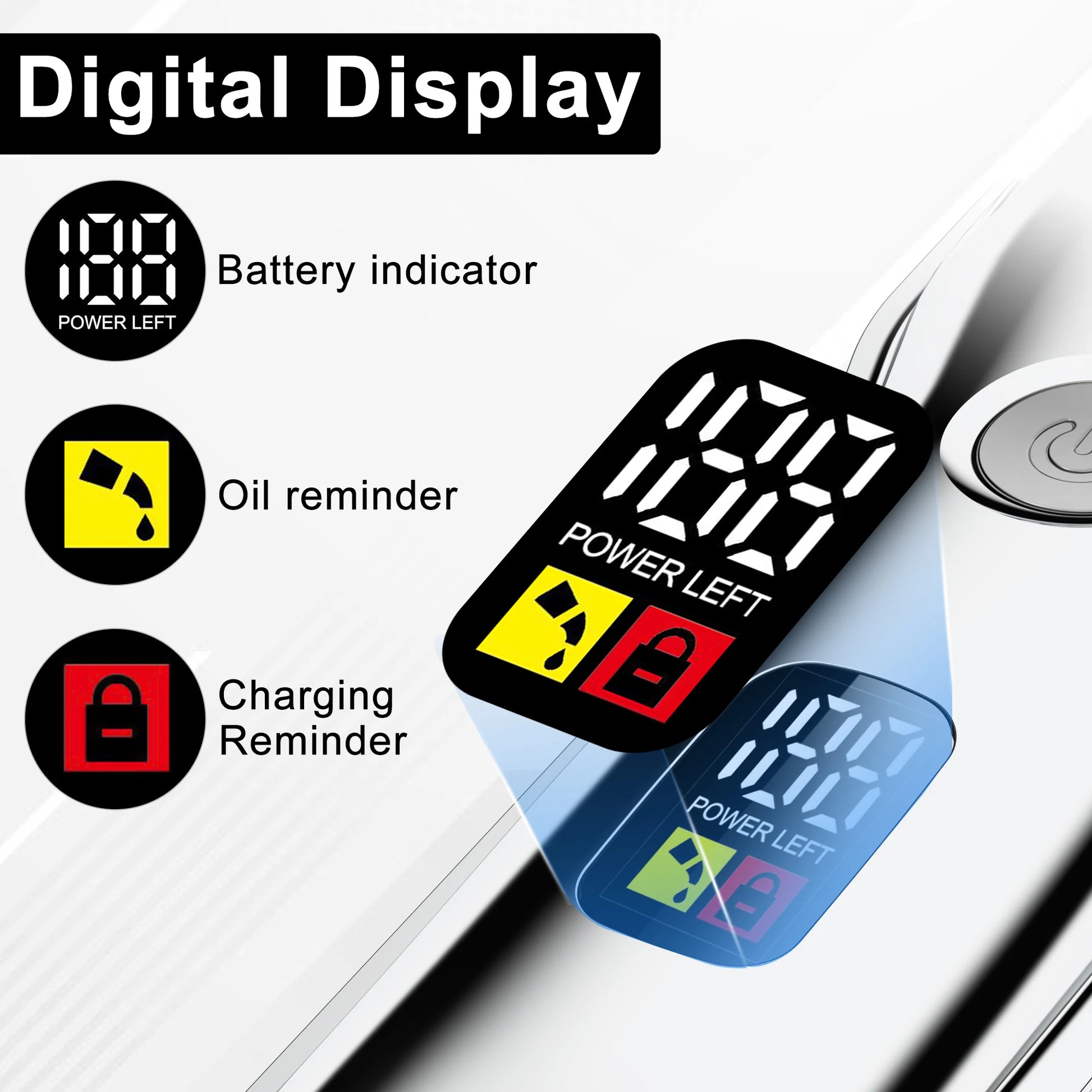 Big unit up to 300 minutes on a 3-hour charge; small unit up to 180 minutes on a 2.5-hour charge. LCD indicators, oil reminder, and USB cables included.